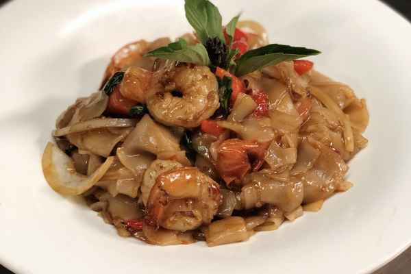Flat rice noodles with bell peppers, tomatoes, onions, and basil leaf.