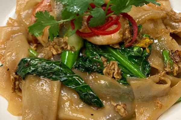 Flat rice noodles with Chinese broccoli, and egg in sweet soy sauce.