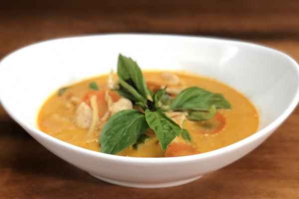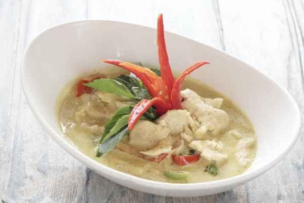 Bambo shoots, bell peppers, basil, carrots, and string beans in coconut milk.