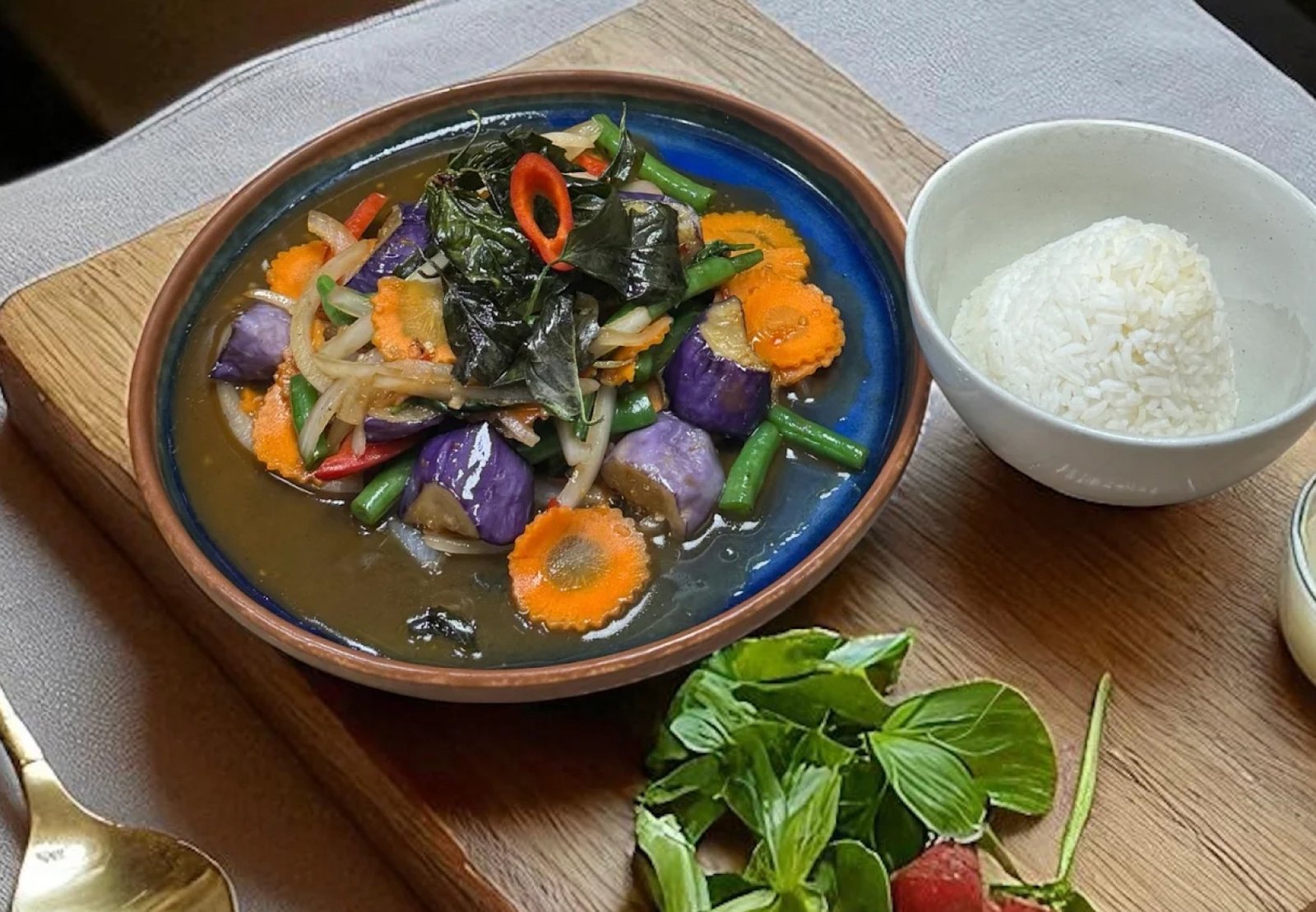 Bambo shoots, bell peppers, zucchini, eggplant and basil leaf in coconut milk.